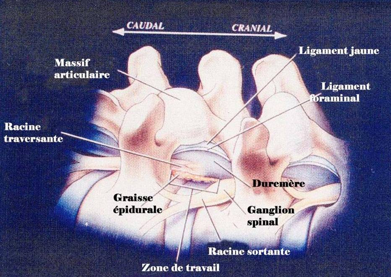 - La seconde, par voie latérale, transforaminale, utilisée par l’auteur.