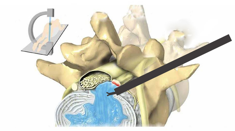 L’utilisation du laser permet avec une grande précision, l’ouverture d’une cavité dans le disque pour faciliter l’extraction de la hernie discale. De plus, cet instrument peut servir à traiter les excroissances arthrosiques (becs-de-perroquet) qui peuvent comprimer les racines nerveuses.